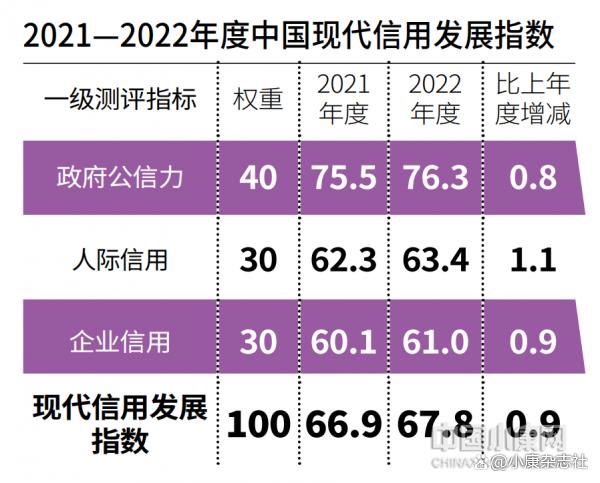 我国社会信用体系建设不断完善,公众的感受又如何呢?2022年6—7月,《小康》杂志社联合国家信息中心,并会同有关专家及机构,进行了“2022中国现代信用发展指数”调查。经过对调查结果进行加权处理,并参照国家有关部门的监测数据和大量社会信息,得出“2022中国现代信用发展指数”为67.8分,比上一年度提高了0.9分。