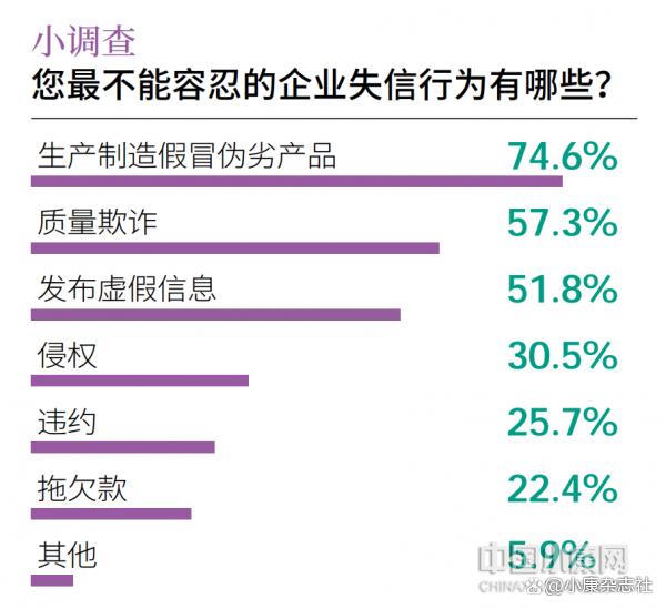 信用的建立需要日积月累,信用的崩塌却只需一瞬间。公众最不能容忍的企业失信行为有哪些?“2022中国现代信用发展指数”调查显示,“生产制造假冒伪劣产品”位居第一,“质量欺诈”排名第二,“发布虚假信息”排名第三,“侵权”和“违约”位列第四、第五位。