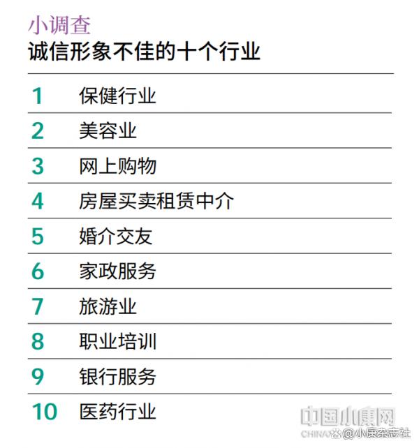 按照惯例,“2022中国现代信用发展指数”调查还请受访者从近30个行业中投票选出了“诚信形象不佳的十个行业”,调查结果显示,排名第一的是保健行业,其次是美容业,再次是网上购物,房屋买卖租赁中介、婚介交友、家政服务、旅游业、职业培训、银行服务、医药行业分列第四至第十位。